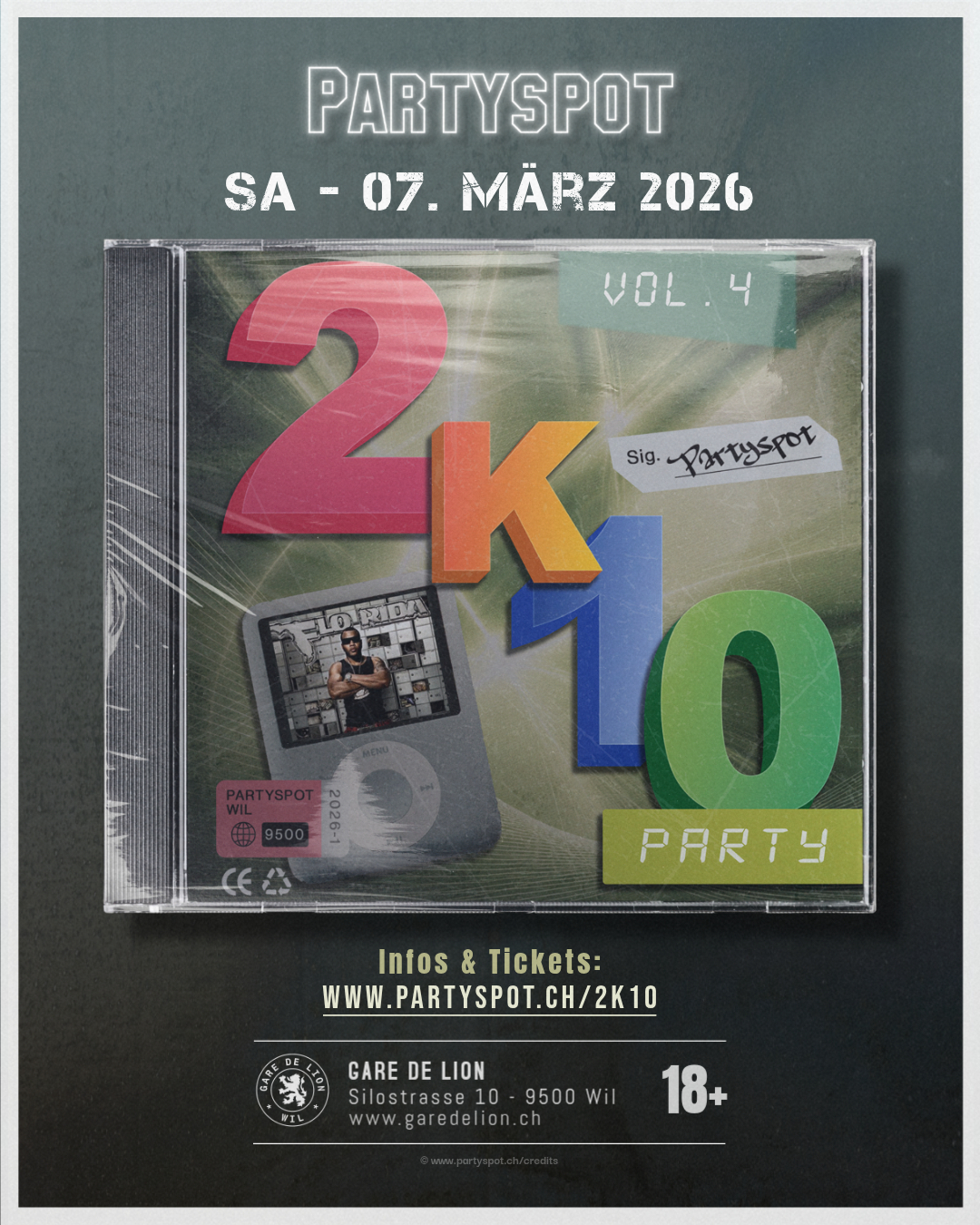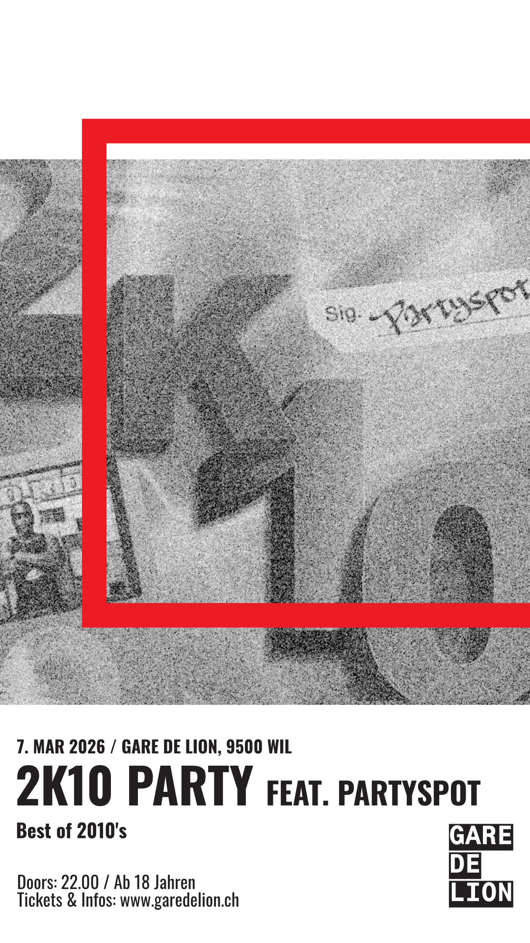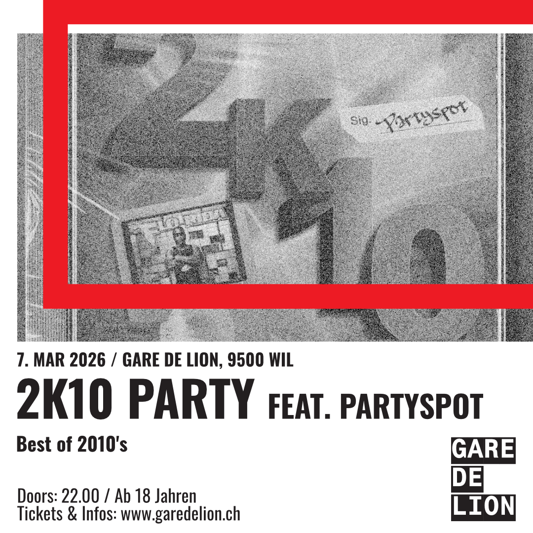 Am 07. März 2026 feiern wir wieder eine 2K10-Party mit dem Gare de Lion. Nach mehreren legendären Nächten und einer längeren Pause sind wir endlich zurück – grösser und lauter als je zuvor. Den ganzen Abend laufen die besten Hits aus den 2010er-Jahren und sorgen für massive Flashbacks. Von den Songs, die man früher rauf und runter gehört hat, bis zu den Tracks, die jede Tanzfläche zum Explodieren bringen. Verschiedene Specials und gewohnte Partyspot- Atmosphäre sorgen für eine grossartige Nacht.