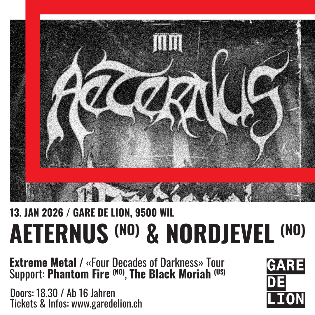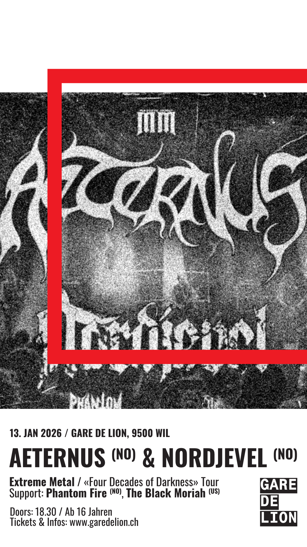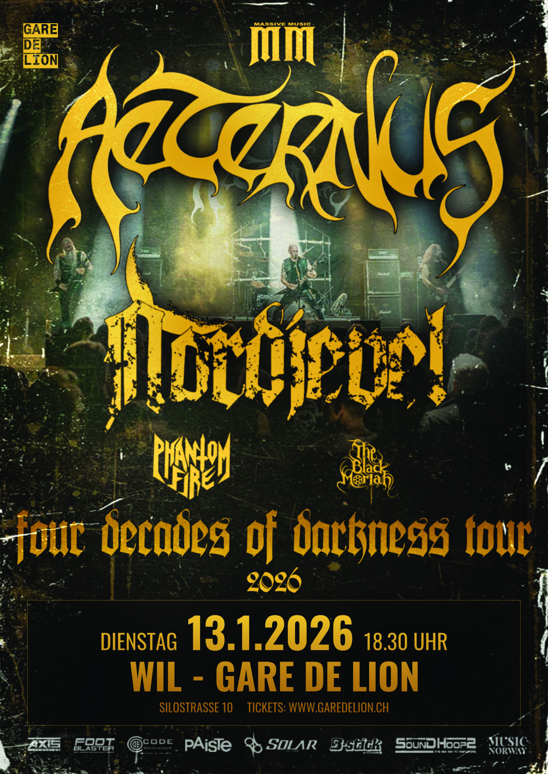 Zwei Giganten des nordischen Extreme Metal auf gemeinsamer Mission: Aeternus feiern 30 Jahre düster-epische Black/Death-Kunst, während Nordjevel mit kompromissloser Kälte und unbändiger Wucht die Bühne in Flammen setzt. Unterstützt von ausgewählten Gästen entfesseln sie auf der “Four Decades of Darkness Tour” eine geballte Ladung nordischer Finsternis – roh, majestätisch und gnadenlos intensiv.