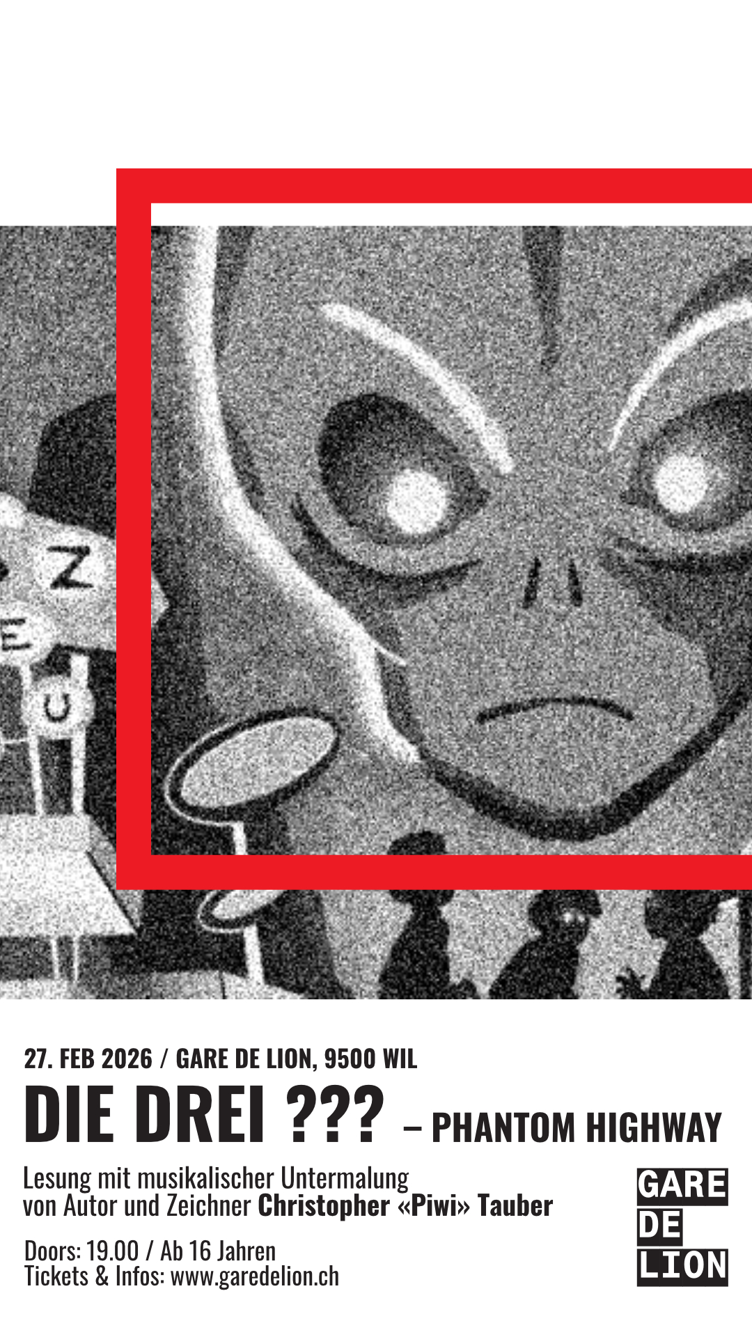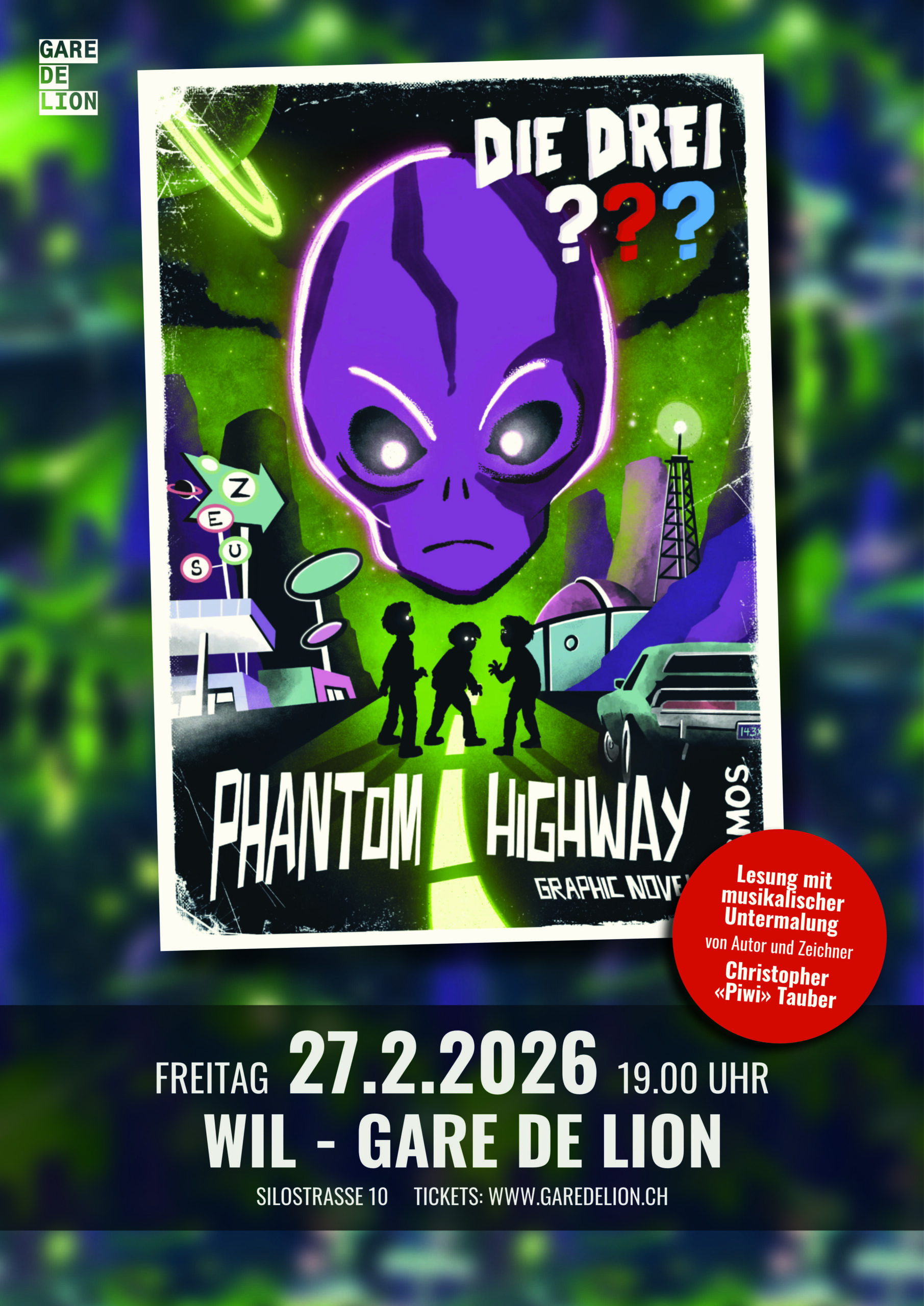 Autor und Zeichner Christopher «Piwi» Tauber liest aus seiner Graphic Novel «Die drei ??? – Phantom Highway» und untermalt die ganze Lesung mit atmosphärischer Musik und mit einer lebhaften Darstellung auf der Leinwand. Die Gäste dürfen sich auf einen spannenden Mix aus Popkultur und Einblicken in die Abenteuer der drei ???  freuen.