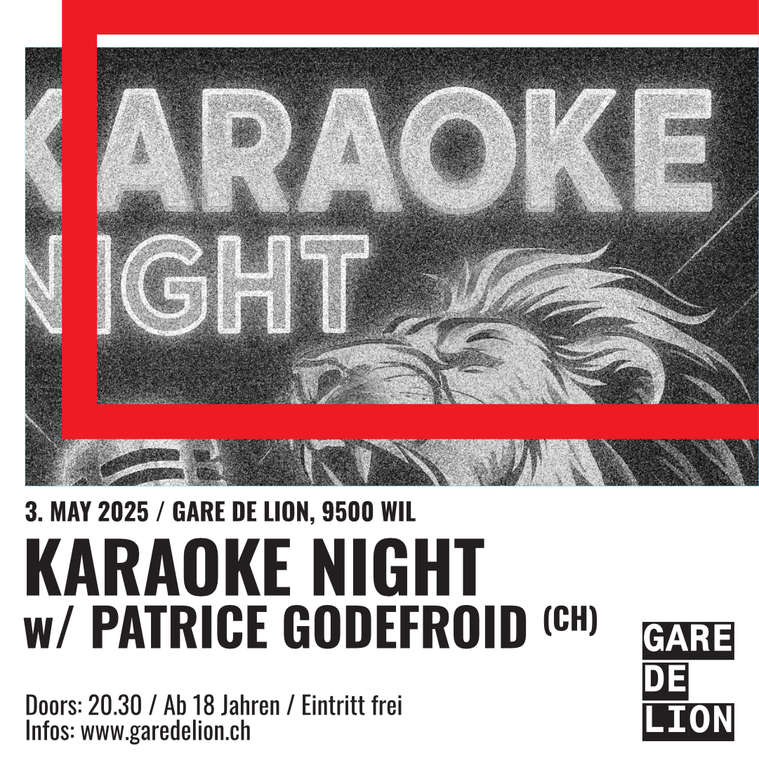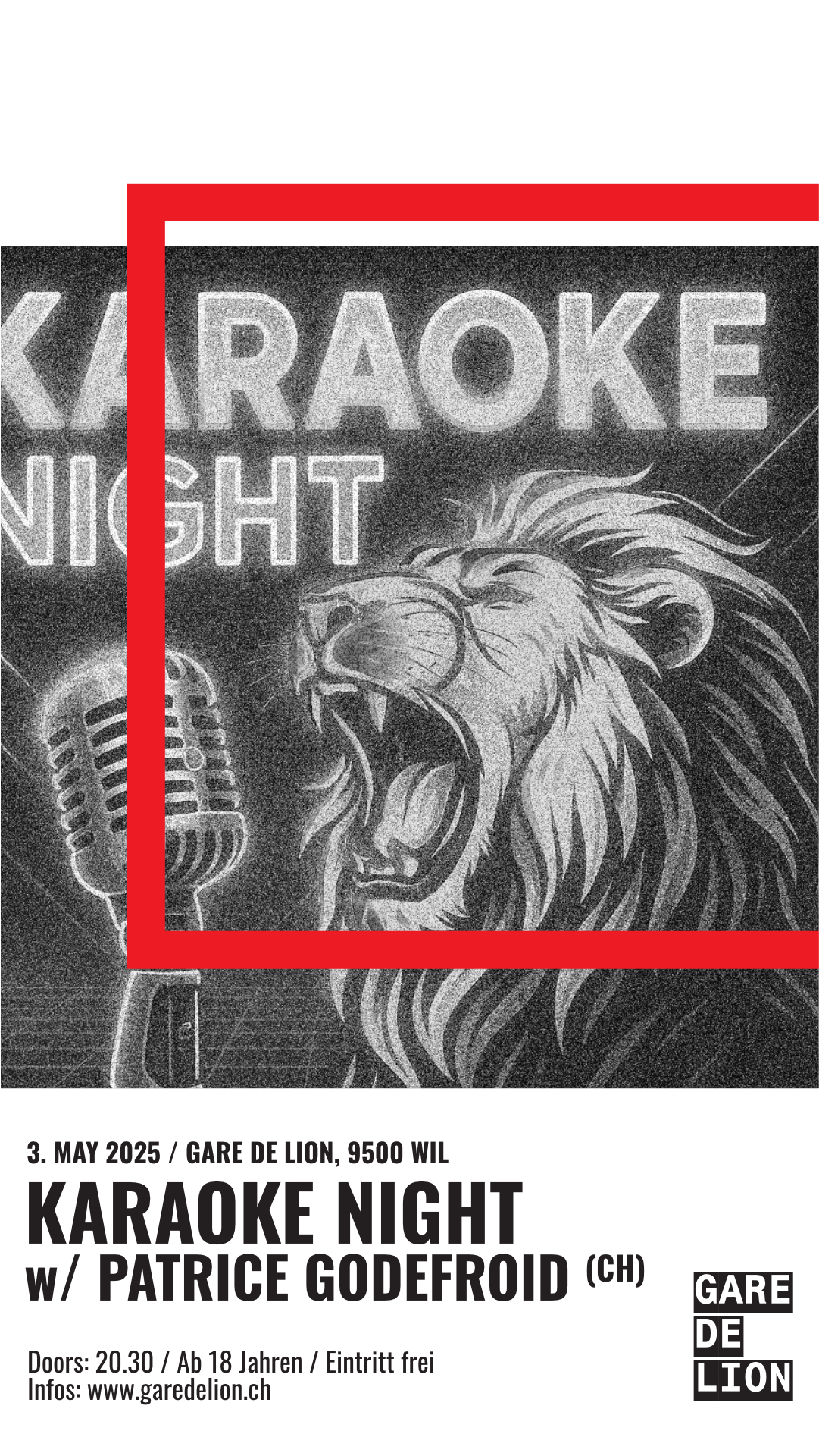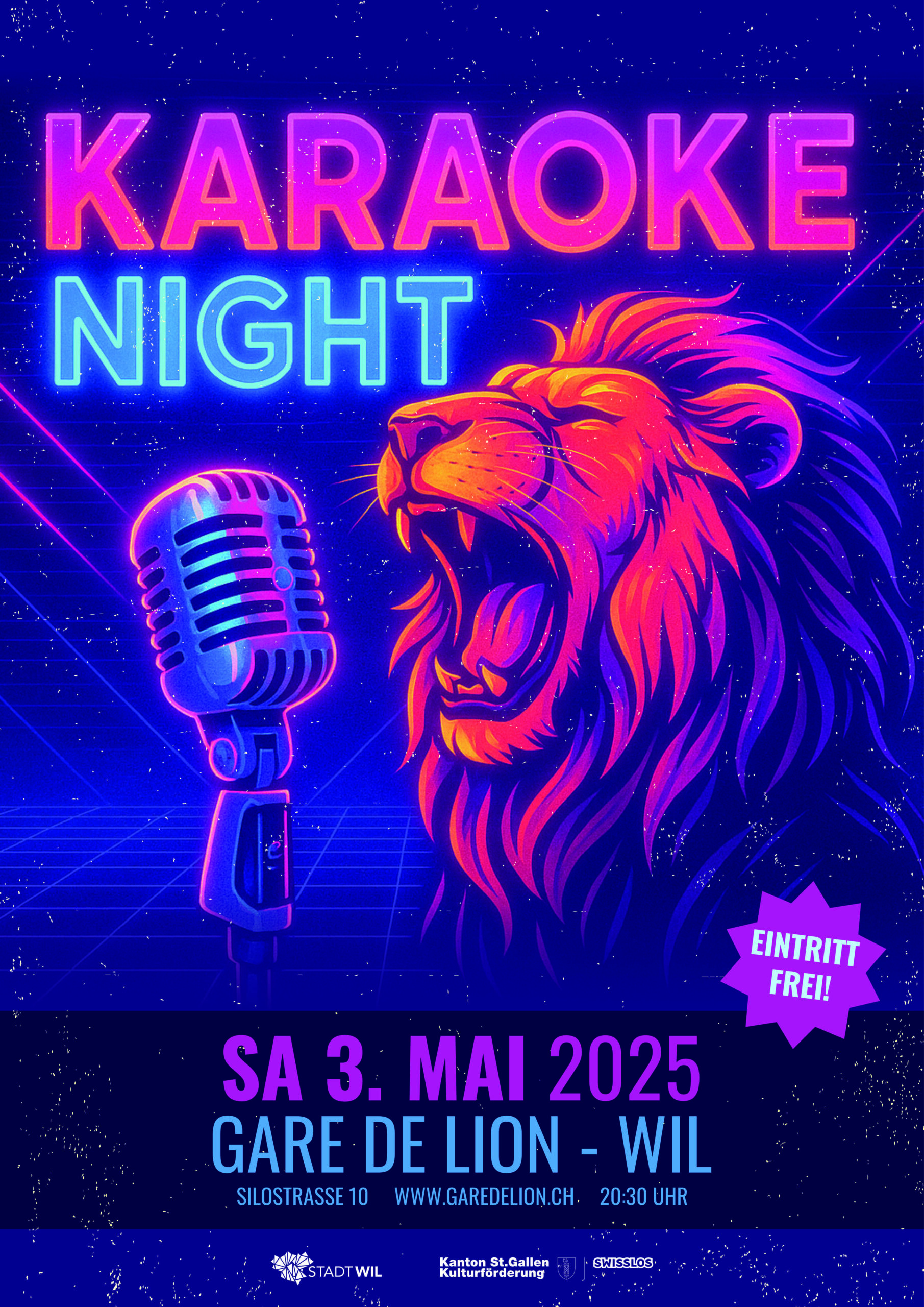 Die grosse Karaoke-Nacht kehrt nach über 10 Jahren zurück in den Kulturbahnhof! Am Samstag, 3. Mai verwandelt sich der Club Gare de Lion in Wil in die ultimative Bühne für alle Gesangstalente und Partyfreunde. Mit dabei: Patrice, der euch durch einen unvergesslichen Abend voller legendärer Hits und bester Stimmung führt. Die Auswahl umfasst über 80’000 Songs! Schnapp dir das Mikro, zeig deine Star-Qualitäten und feiere mit uns bis in die Nacht!