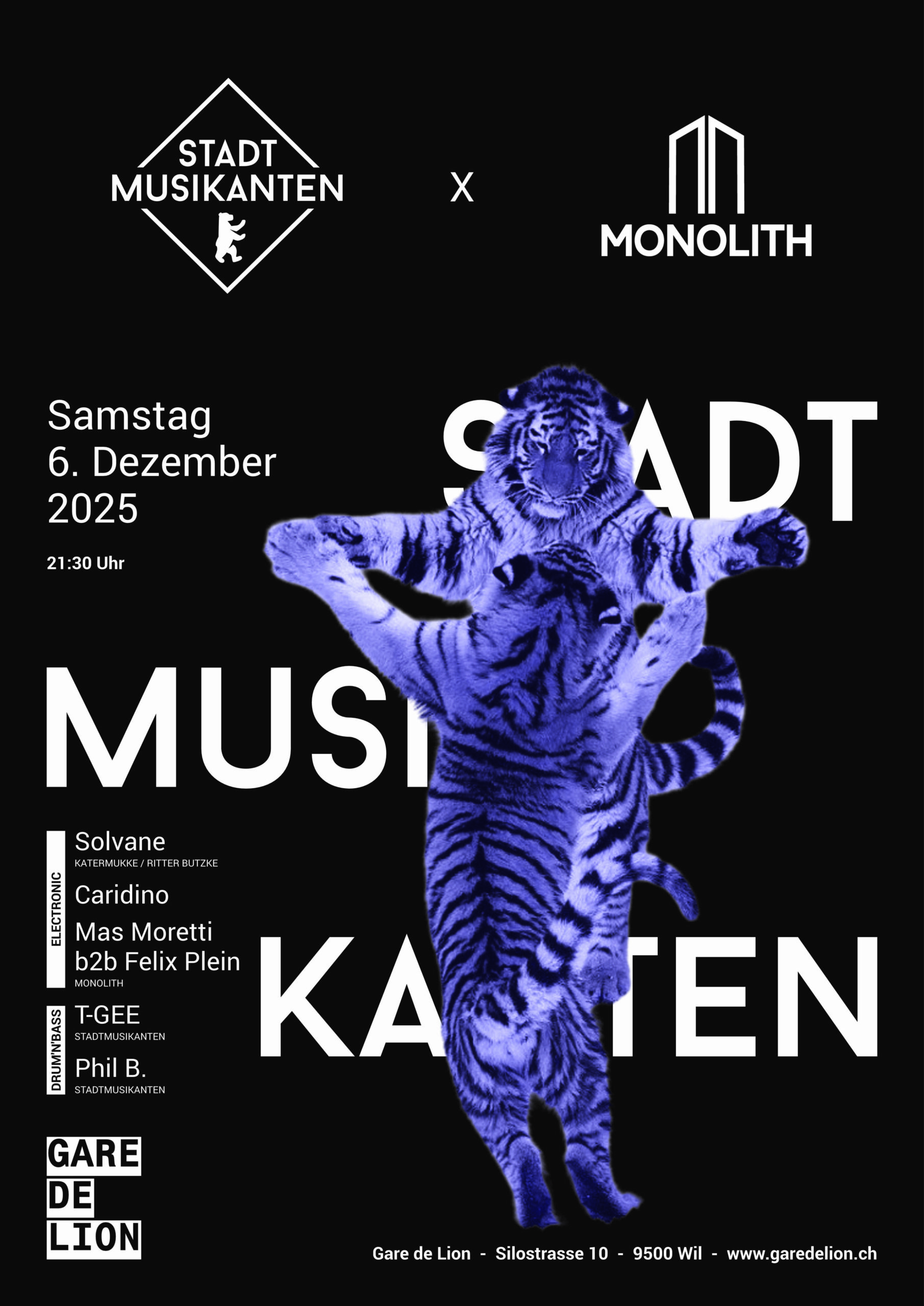 Der Gockel schreit es bereits vom Dach: Die Stadtmusikanten begeben sich einmal mehr für eine Nacht voller verrückter Klänge und treibender Melodien in den Bahnhof des Löwen. Dieses Mal mit unseren Freunden Mas Moretti und Felix Plein vom Zürcher Label Monolith, welche in Wil nicht unbekannt sind. Zum ersten Mal bei uns spielt Caridino aus St.Gallen – man darf sich auf ein treibendes Set mit Tiefgang freuen. Es steht uns ohne Zweifel eine tierische Tanznacht bevor und wir freuen uns auf ein grosses Fest der elektronischen Musik -und ganz besonders auf unseren Freund Solvane aus Berlin!