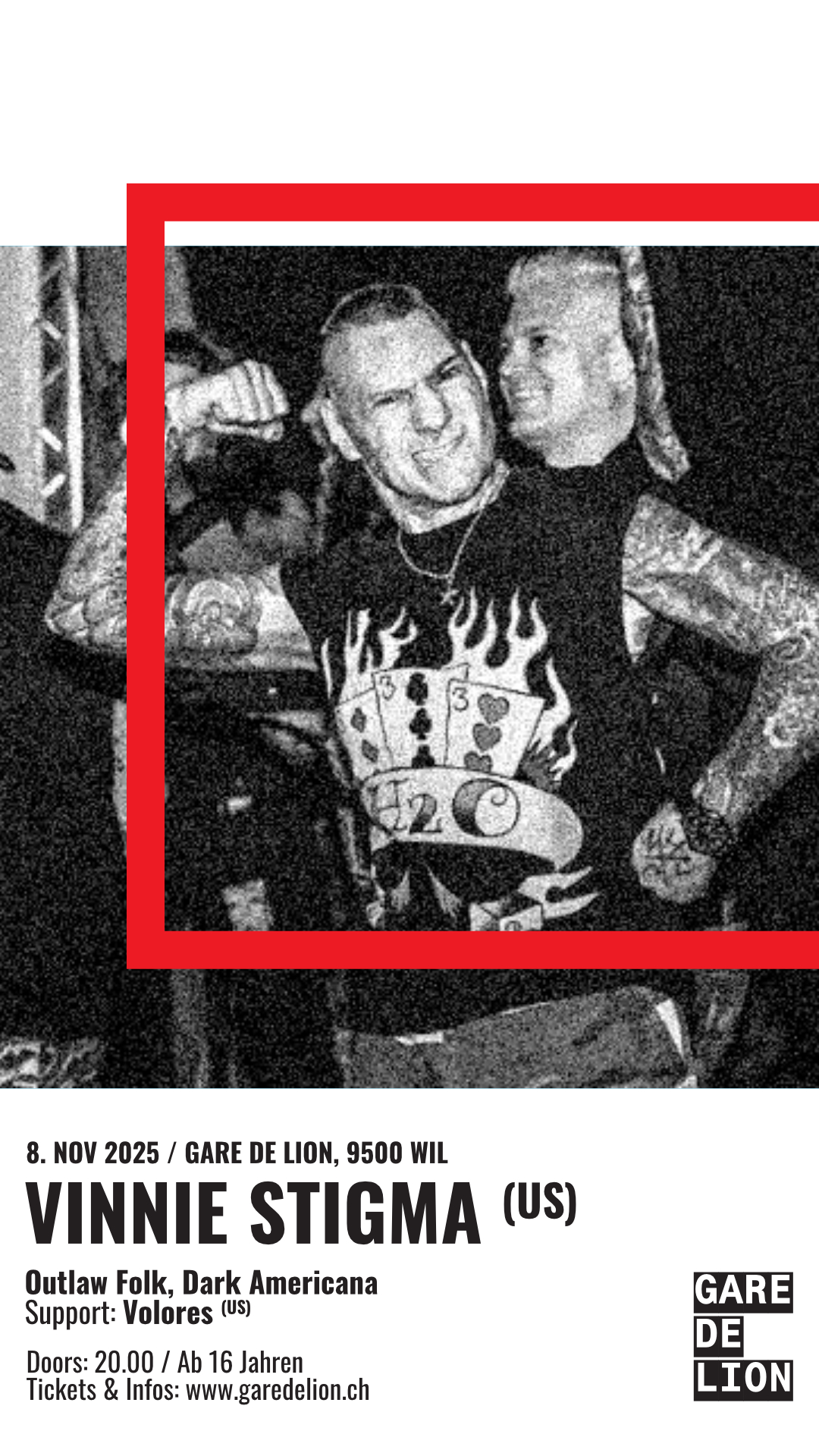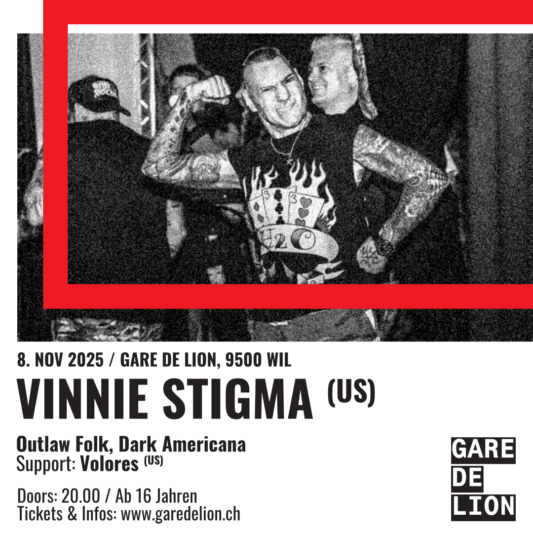 Vinnie Stigma muss man wohl niemandem mehr vorstellen. Eben war er noch mit seiner Band Agnostic Front auf Tour und jetzt kommt er im Winter schon wieder zurück nach Europa, um auf Solopfaden zu wandeln. Der Mann scheint einfach unkaputtbar zu sein. Auf seiner Solotour wird er Songs von seinem eben erst veröffentlichten Album The Outlaw spielen. Zu sagen sei noch, dass es sich bei dem Album nicht um ein Hardcore-Album handelt, sondern eher um ein Country/Western/Folk-Album. Begleitet wird er von einem All-Star-Lineup mit Leuten von US BOMBS und Floggy Molly als seine Backing-Band.